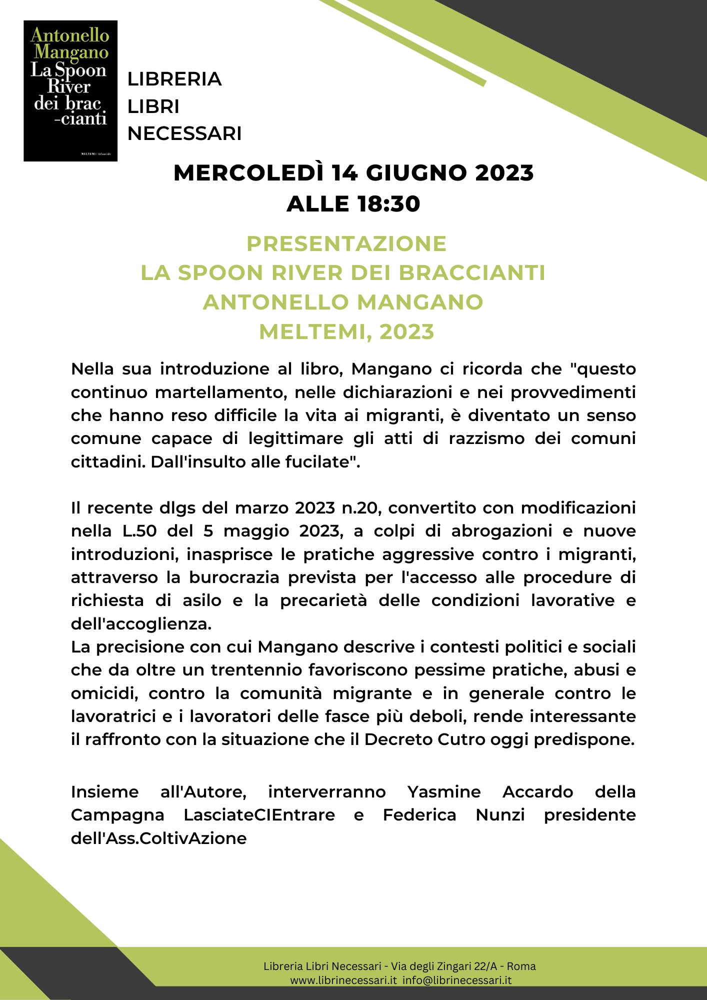 Insieme all’Autore, interverranno Yasmine Accardo della Campagna LasciateCIEntrare e Federica Nunzi presidente dell’Ass.ColtivAzione
